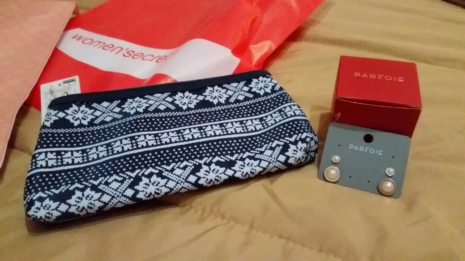 Bolsinha da Women'secret e conjunto de brincos da Parfois da Amiga Inês da Faculdade!