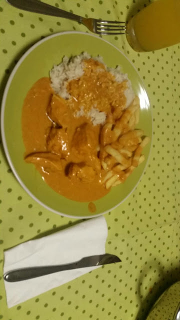 Pessoalmente acompanho sempre com arroz e batata frita e gosto de ensopar ambos no molho de caril, uma delícia!!! 🍽